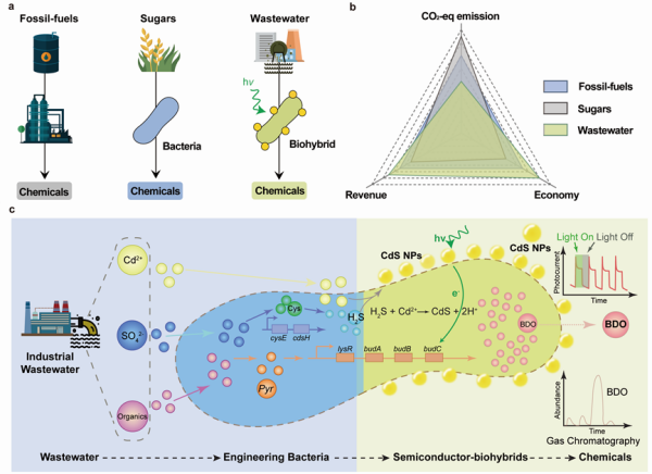 近年来,通过合成生物学方法改造微生物细胞工厂,可直接利用废弃塑料、餐厨垃圾和工业废气(如CO2)等作为原料,展示出绿色可持续生产化学品的潜力。深圳先进院合成生物学团队和哈工大(深圳)环境科学与工程团队调研发现:金属离子、硫酸盐和有机物等污染物在废水中普遍存在且含量丰富,可直接或间接为半导体材料-细菌杂合体生产提供原料,降低规模化生产杂合体的成本;该杂合体在废水中能够直接利用光能驱动有机污染物转化为化学品,实现污染物的资源化利用。