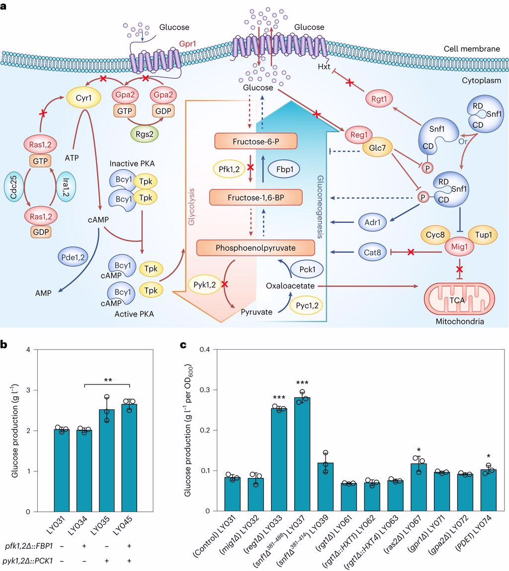 团队然后调控碳源的混合使用以及比例,进一步提高了酵母细胞生长和葡萄糖产量。